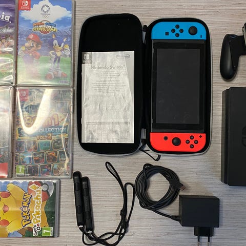 Myynnissä on Nintendo switch, gamepad wireless controller, Rig 300 pro gaming headset, joykon ohjain 2kpl, Nintendo switch lataus pidike, Nintendo switch suojakotelo,