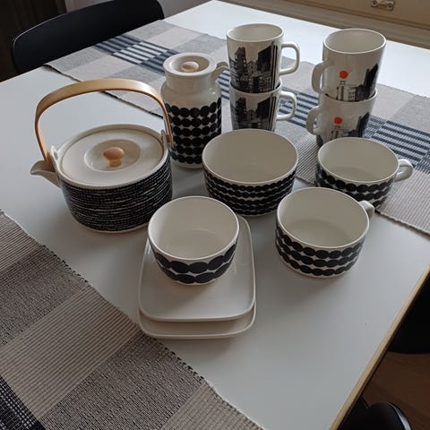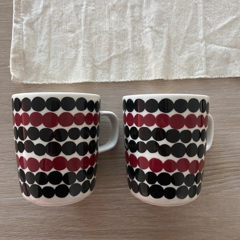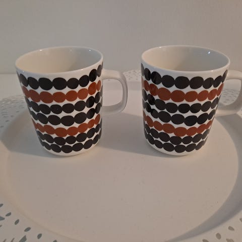 Vähän käytetyt, lähinnä koristeena olleet Marimekon räsymatto mukit ja lautaset. Mukin vetoisuus 2,5dl. lautanen 20cm.