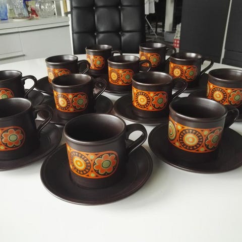 Myynnissä tyylikäs setti Englannissa valmistettuja tumman vihreitä posliini/keramiikkamukeja. (pohjassa merkintä Kilncraft STL England). Valmistettu todennäköisesti vuosina n. 1970 - 1985, eli eivät ole antiikkia, mutta selkeästi vintagea. Mukit ovat hyvässä kunnossa. Mukien lasite on elävä — hieman marmoroitu/virtaava efekti, joka tekee sävystä kiinnostavan ja uniikin.
