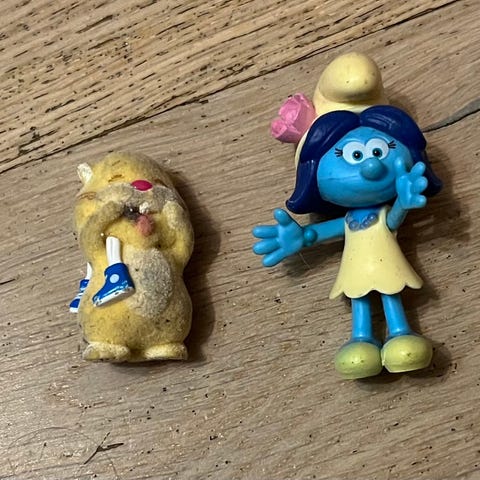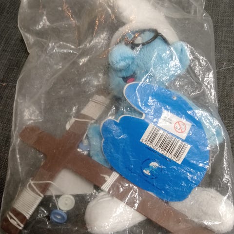 Vanha Mäkkärin lelu 2000 vuodelta. Ikäisekseen Smurffi on hyvässä kunnossa.