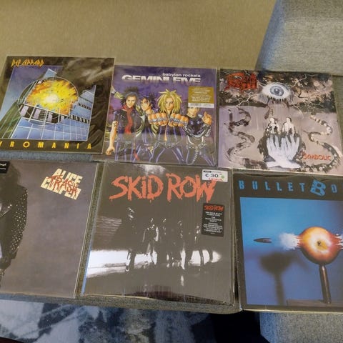 Kaikki 80 luvun lpt, näissä kaikissa splatter effect/ne ovat eri värisiä esim theater of pain on pink splatter