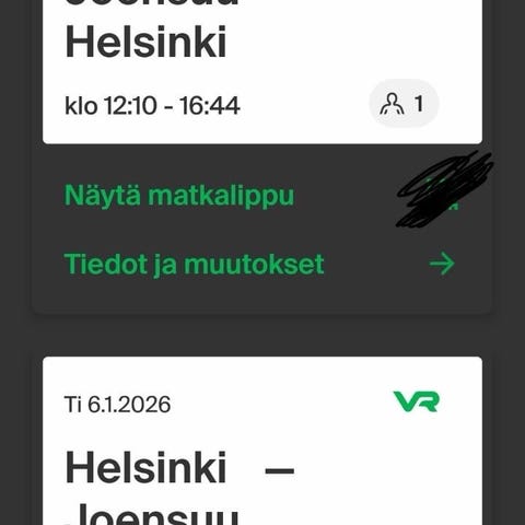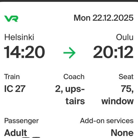 VR junalippu reitille Helsinki - Oulu, voimassa 19.12.2025 klo 5:03 Lähtö Helsingistä. 2 kpl . Hinta 50€/kpl