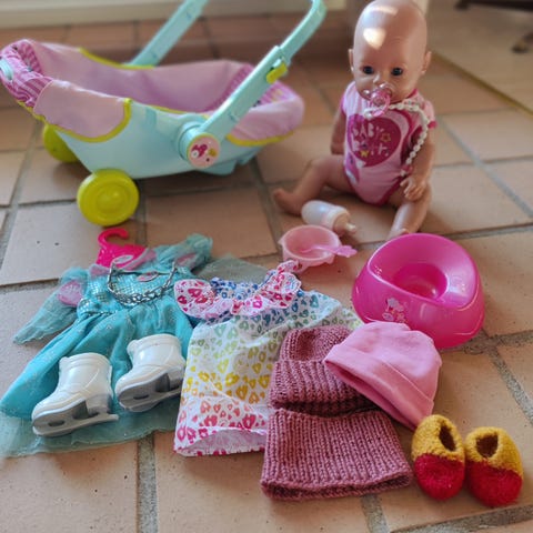 Baby Born isosisko nukke (sister) ja kaikki kuvassa näkyvät tarvikkeet sekä ohjekirja. Erittäin hyvässä kunnossa, ollut yhden tytön vähillä leikeillä.