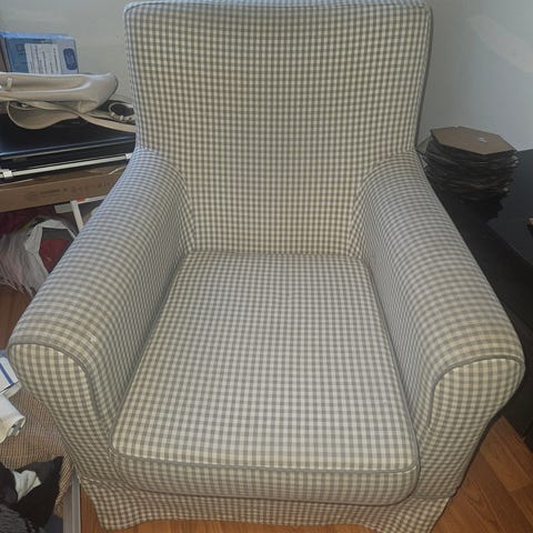 Valkoinen Ikean Jennylund-nojatuoli, jonka päällinen on siistissä kunnossa.