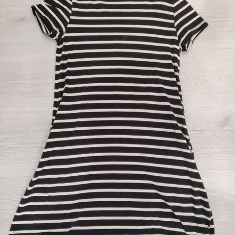 Siisti Onlyn S kokoinen trikoomekko. Yläselässä narut ristissä, lyhyet hihat. Vain pari kertaa käytetty. Mustavalkoinen raidallinen kuosi.