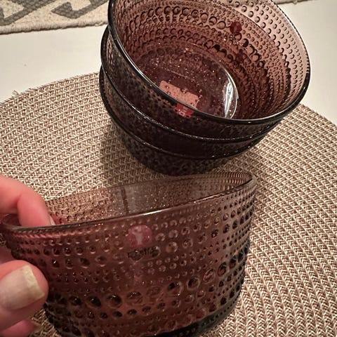 Iittala Kastehelmi kulhot, värissä kanerva. Ei ole käytetty, mutta tarrat otettu pois.