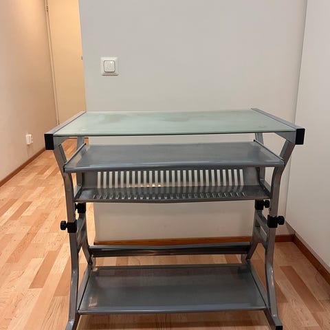 Tietokonepöytä, musta metaalirunko, lasitaso, 35x65 cm.