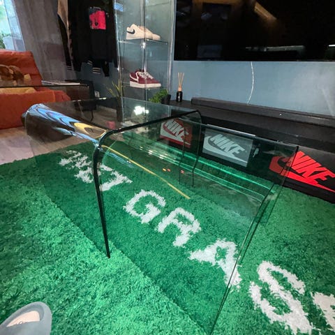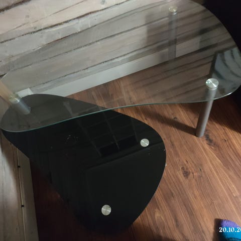 Painavalla lasilla oleva lasipöytä, lasin alla olevat tassut tai tarrat uusittava niin lasi pysyy paikallaan. Vain nouto