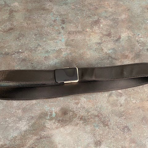 Black genuine leather YSL belt with metal details. The belt has minor wear to it, especially one spot has a visible wrinkle; however overall is in good condition. The code is hard to read from the pictures, it says: GRZ530183 90 0518