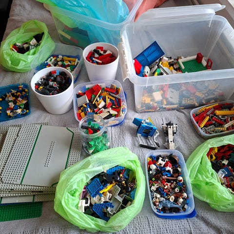 Myydään iso setti legoja. Mukaan kuuluu kuvastossa näkyvät osat, paitsi kolme palaa puuttuu: 1 keltainen kukka, 1 keltainen ikkunaruutu ja 1 punainen kaari. Myös setin säilytyslaatikko kuuluu mukaan.