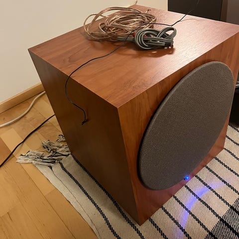 Subbarissa volyyminapissa jotain häikkää, välillä kuuluu välillä ei. Subbari siis vaatii korjausta. Pikkukaiuttimet kunnossa. Mukaan seinäkiinnikkeitä.