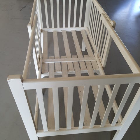 Hyväkuntoinen ja yleissiisti pinnasänky. Muutamasta kohdasta kolahtanut maali pois kosmeettisena haittana. Sängyn laitakorkeus on max 76cm ja päädyn kokonaiskorkeus 102cm. Pohjan koko/patjan koko on 113cm x 53.
