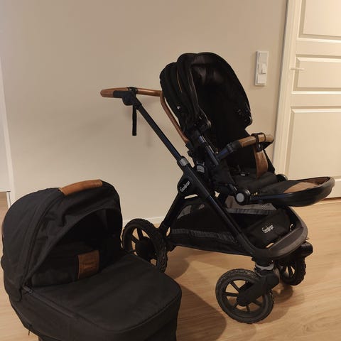 Rattaissa musta kangas ja ruskeat nahkatyyliset yksityiskohdat. Kangas ei ole haalistunut auringossa. Kuomussa verkkotoiminto sekä heijastimet – sekä kopassa että istuinosassa.