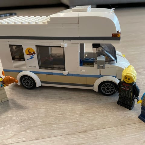 LEGO matkailuauto lelu, jossa on punainen ja valkoinen väri. Sisältää matkailuauton, perävaunun ja useita hahmoja. Matkailuautossa on avattava osa, joka paljastaa sisätilat, kuten keittiön ja oleskelualueen. Leikkiin soveltuva lasten lelu.