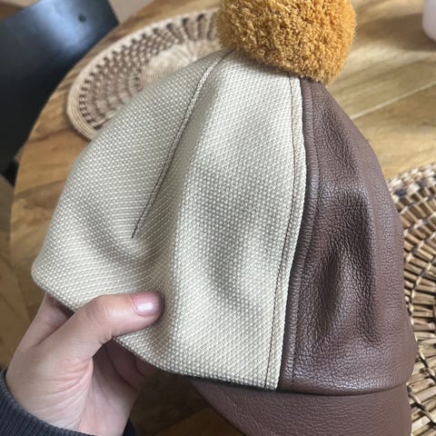 Coston beigen värinen hattu turkoosilla tupsulla.