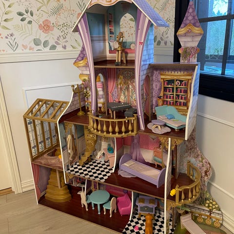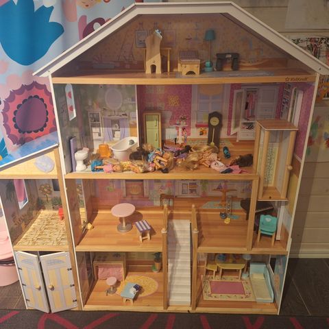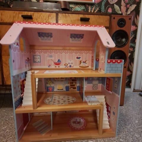 Nukketalo, puiset kalusteet sekä asukkaat.