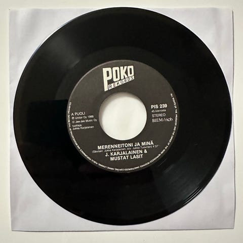 Myynnissä hyväkuntoinen J. Karjalainen & Mustat Lasit Irmeli / MÄ MEEN -single. Visuaalinen kuntoarvio on EX-.