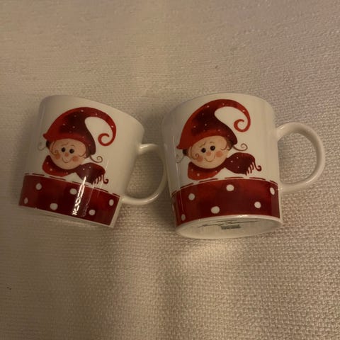 Arabia tonttumukit, 6 kappaletta. Mukit ovat posliinia ja niissä on jouluaiheinen kuvitus. Kaikki ovat erinomaisessa kunnossa.