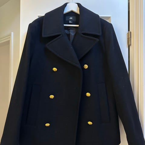 H&M musta takki, koko 46, valmistettu polyesteristä. Takki on suunniteltu miehille ja sopii ulkoilukäyttöön. Takissa on kaksirivinen napitus ja pitkä malli.