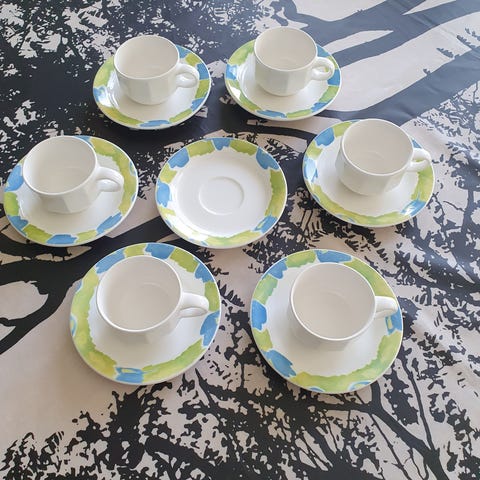 Myydään muuton tieltä todella siisti Villeroy & Boch kuuden hengen Geo-astiasto pl. ruokalautasia 5 kpl. Astiasto sisältää: