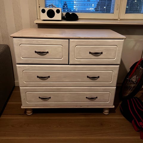 Puinen pikkulipasto jossa koristepunosta sivuissa,päällä ja laatikoiden etuosissa.