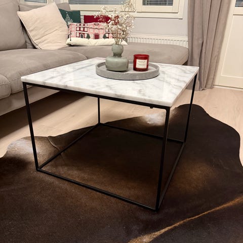 Myydään marmorinen sohvapöytä. Tukeva ja vankka rakenteinen musta metallirunko.