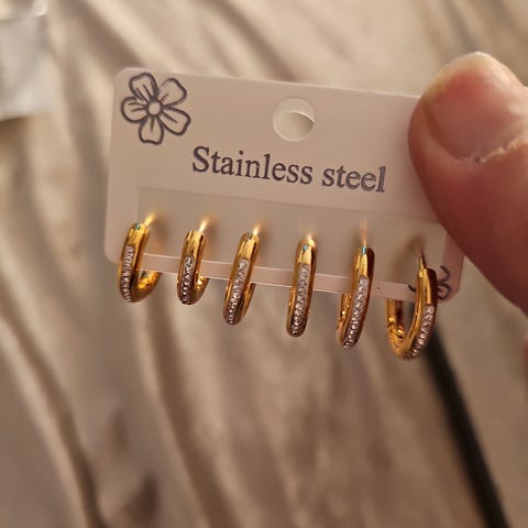 Pyöreät, valkokiviset korvanapit, joissa on strassikoristeet ja kultainen kehys. Myytävänä myös muualla.
