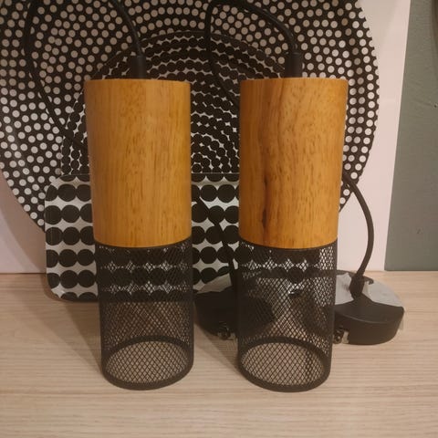 On toiminut keittiöpöydän valaisimena. Lamppu (E27, 6W LED, kuuluu kauppaan) on tässä mallissa sijoitettu kätevästi vähän syvemmälle, niin ettei se häikäise vaan kohdentaa valon alas "spottimaisesti". Kuvassa setin pituus katosta valasimen alaosaan on 90 cm, ja johtoa (sävyyn sopiva harmaa) on reilusti lisää.