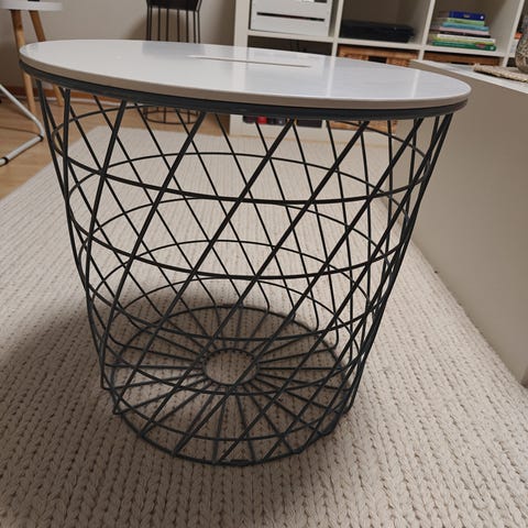 Valkoinen säilytyskoripöytä. Edellinen omistaja oli liimannut jonkun vanerilevyn kansiosan päälle. Oli tarkotus maalata, mutta ei olekaan paikkaa korille. Itse kori näyttää ihan siistille, en löytänyt muuta huomautettavaa kuin pölyä säilytyksestä.