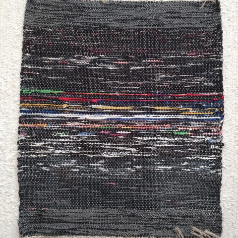 Myyntiin kesällä pesty ja sen jälkeen varastossa maannut räsymatto. Käsintehty kangaspuilla matonkuteista - ei siis mitään tehdaskamaa. Hyvässä kunnossa, värit vielä selkeät.