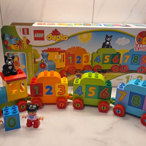 Sisältää 10 numeropalikkaa (1-10), koiran, lapsihahmo, 3 vaunun alustaa, juna ja muita valikoituja palikoita.