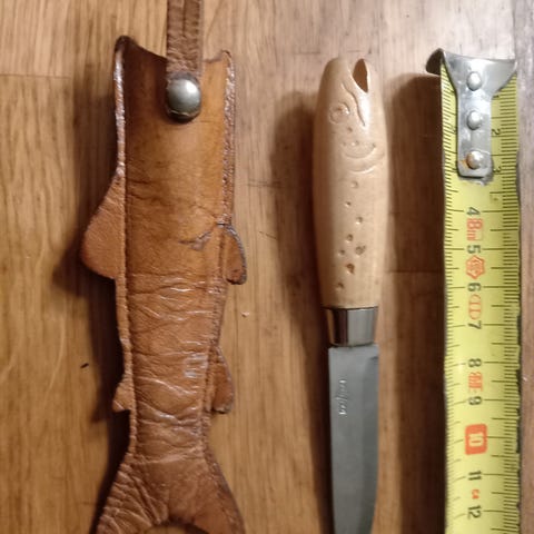 Kalastus aiheinen hattutuppi puukko.Maksu mobilepay tai tilisiirto ja posti 8.90 ostajalle
