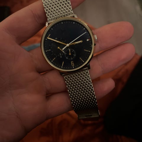 Alkuperäinen Tommy Hilfiger kello korjattavaksi asian osaavalle. Kello on kerran pudonnut sängyltä ja taulusta irronnut kultaisia viivoja. Kellon moottori toimi normaalisti ja linssi on ehjä. Viivat on otettu pois sisältä kultasepän toimesta ja kelloa on käytetty, kunnes nahkainen ranneke on murentunut.