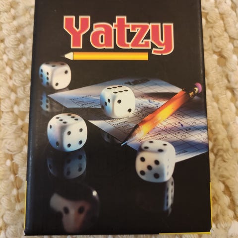 Puinen jättiyatsy. Sisältää 5 noppaa, pelivihkon ja verkkopussin.