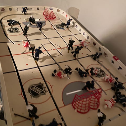 Stiga Peter Forsberg edition pöytäjääkiekko, Pelissä on musta kehys ja jalat tukevat pöytää pelin aikana. Mukaan myös pari kiekkoa ja minijalat pöydällä pelaamista varten.