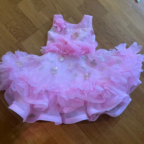 Ihana, Englannista ostettu juhlamekko. Primaek on mielestäni niukkaa mitoitusta eli voiso sopia myös kokoa 98 käyttävälle.