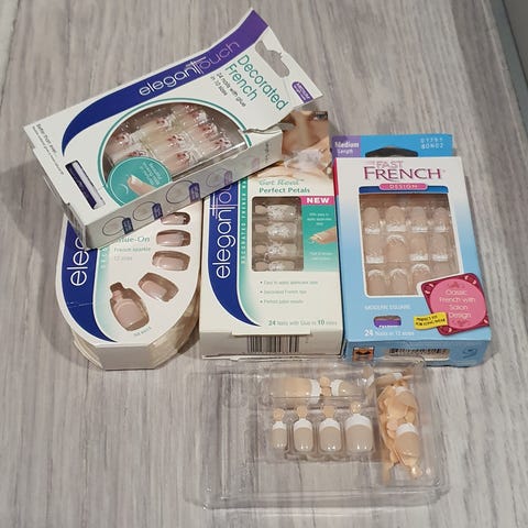 Tuhansia paketteja vanhoja, mutta avaamattomia ja käyttämättömiä liimattavia tekokynsiä. Näitä on kahta mallia, toisessa mallissa valmiiksi ihan surkea liima mukana 😅