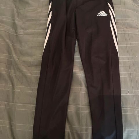 Adidas merkkiset, pääväriltään mustat verkkarit. Sivuilla siniset raidat. Lahkeensuissa vetoketjut. Taskutkin löytyy. Erinomainen kunto. Koko 160 junior.