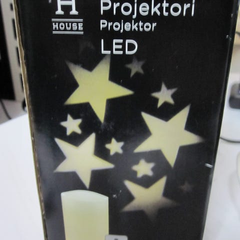 Jyskin galaxiprojektori, jossa valittavana useampi ei väri. Valon saa liikkuvaksi tai pysäytettyä stabiiliksi. Latauspiuha on kadonnut, itse olen aina käyttänyt uudelleenladattavia AA-pattereita, niitä menee projektoriin kolme. Sekä projektori että kaukosäädin toimivat niinkuin pitääkin.