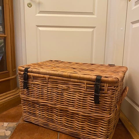 Vanha rottinkinen arkku, ehjä, vetokahvat sivuilla, koko 66cm pituus, 45cm leveä ja 38cm korkea.