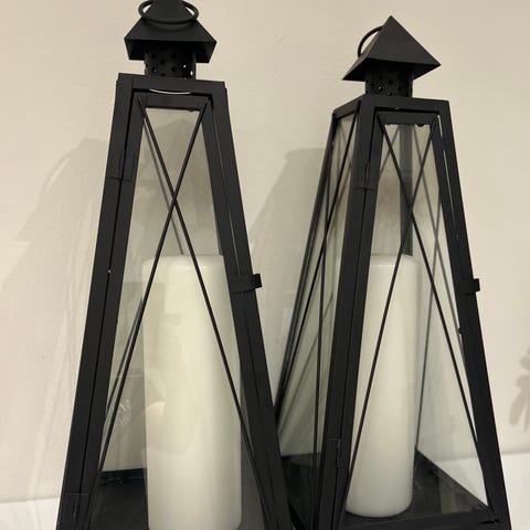Myydään mustaväriset lyhdyt ulkokäyttöön. 2 kappaletta. Korkeus 25 cm, diam 15,5cm. Ketjun pituus yhdellä 47 cm ja toisella 42 cm.