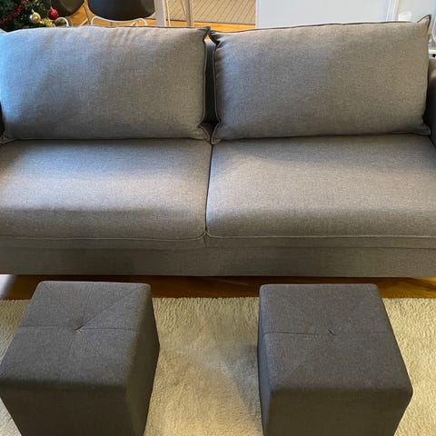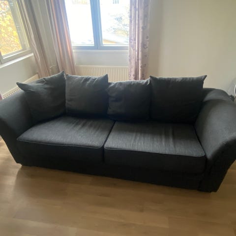Harmaa divaanisohva mustilla jaloilla. Noin 4 vuotta ollut käytössä mutta yhä hyvässä kunnossa, ei tahroja. Sohva on imuroitu, ostaja voi halutessaan pestä.