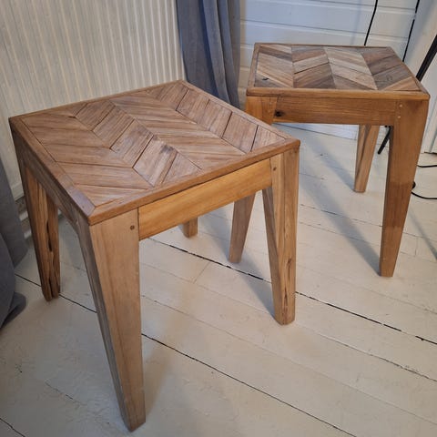Pentikin jakkara teakia. Tehty kierrätyspuusta ja puussa on tarkoituksella "jälkiä". Ollut meillä jakkarana ja yöpöytänä. Vain nouto.