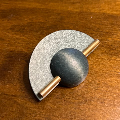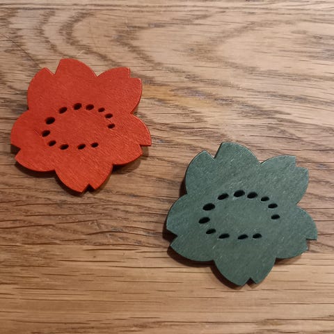 Aarikan puiset joulukuusirintaneulat, vihreä 15 euroa, punainen 10 euroa. Nouto Töölöstä.