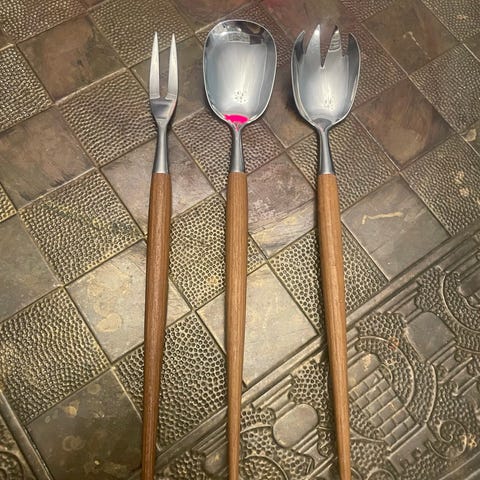Kuvan vanhoja teakpäisiä salaatti ottimia ja yksi veitsi. Pisin oikealla 33cm Yhteishinta Lohjalla
