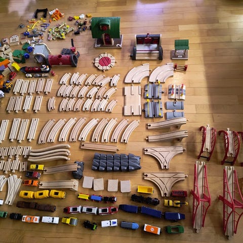 Tässä setissä on eri merkkejen rataosia sekä verureita. Osa vetureista toimii pattereilla. Kolme näistä ei lähtenyt toimimaan. Yksi musta veruri on ladattava ja se lähti toimimaan. On ollut hetken käyttämättä ja vaati pidemmän latauksen. Mukaan saa myös muutamia verureita jotka ei varsinaisesti puuradalle kuulu. Meidän pojat on näillä kovasti leikkineet ja rakentaneet hienoja kokonaisuuksia. Mukaan saa muovisen säilytyslaatikon joka mahtuu sängyn alle.