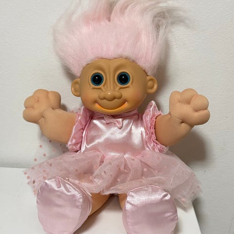 Russ trolli 1990-luvulta. Korkeus kokonaisuudessaan n. 30 cm. Alkuperäinen asu päällä.