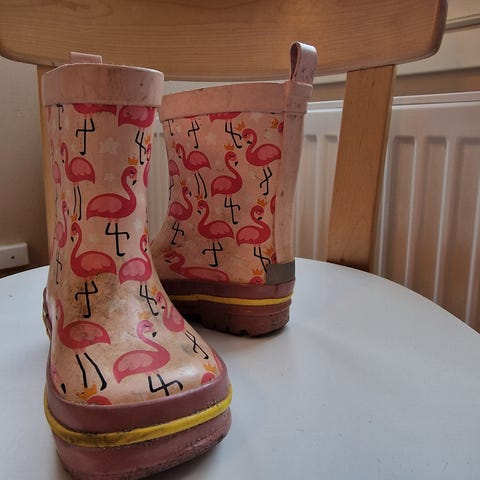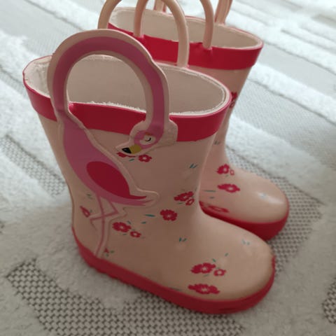 Mywear lasten kumisaappaat, koko 22. Saappaiden värit ovat oranssi ja musta, ja niissä on eläinaiheinen kuviointi. Saappaat on varustettu kahvoilla, jotka helpottavat pukemista. Pohja on kuvioitu liukastumisen estämiseksi.
