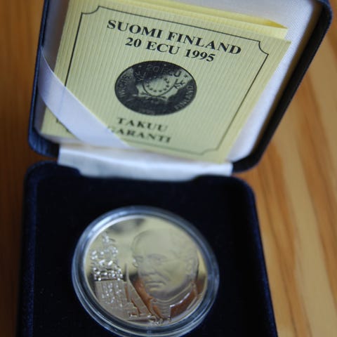 Suomi 20 ECU 1995 juhlaraha hopeaa. Paino 24,98g. Mukana alkuperäinen kotelo ja takuukortti. Rahan etupuolella on kaksi poroa ja takapuolella J.L.Runeberg. Erikoisraha, joka on valmistettu 925 ‰ hopeasta. Nro 975/25000.