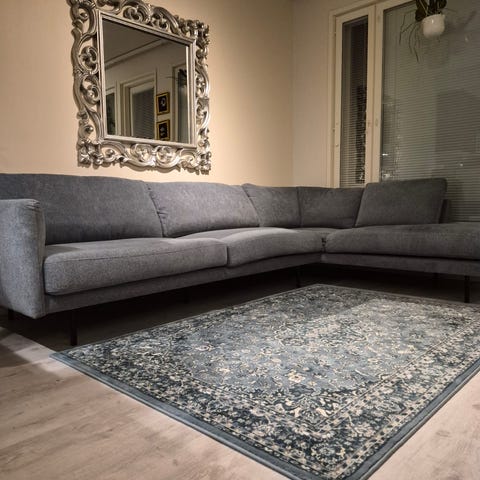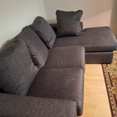 Käsitelty kahdesti tekstiilinsuoja-aineella ja sohvatyynyjen päälisiä pesty säännöllisesti. Viimeinen puhdistaminen jää ostajalle.